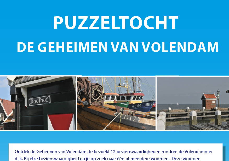 Puzzeltocht 'De Geheimen van Volendam' is een verrassende puzzeltocht langs de mooiste plekjes van Volendam. Je bezoekt 12 bezienswaardigheden rondom de Volendammer dijk. Zo bezoek je de authentieke visafslag, het beroemde Hotel Spaander, de unieke Stolphoevekerk en de kleine vissershuisjes in het Doolhof. De juiste woorden vind je alleen, wanneer je bij elke bezienswaardigheid goed om je heen kijkt. Ook vind je een vraag over de Volendamse artiesten en bekijk je een videoclip van één van de grootste kermishits allertijden. Wanneer je bij alle locaties de juiste antwoorden vindt, ontdek je de geheimen van Volendam. Zeker is ook dat je na deze puzzeltocht meer van Volendam weet dan een gemiddelde Volendammer, want in de puzzeltocht vind je veel leuke weetjes.